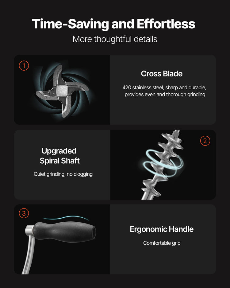 - Versatile Ingredient Processing: Our hand crank meat grinder can grind various meat ingredients such as beef, pork, fish, and chicken racks, and it can also grind vegetables with low moisture like mushrooms and peppers. #8 caliber simulates the manual process of meat mincing, which greatly retains the original taste, keeps the meat fresh, and 100% locks the texture and nutrition of the meat.